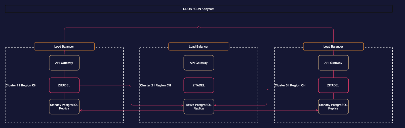 To scale Zitadel across regions it is recommend to create at least three clusters. Each cluster is a fully independent ZITADEL setup. To keep the data in sync across all clusters, we recommend using Postgres with read-only replicas as a storage layer. Make sure to read our Production Guide before you decide to use it. Consult the Postgres documentation for more details.