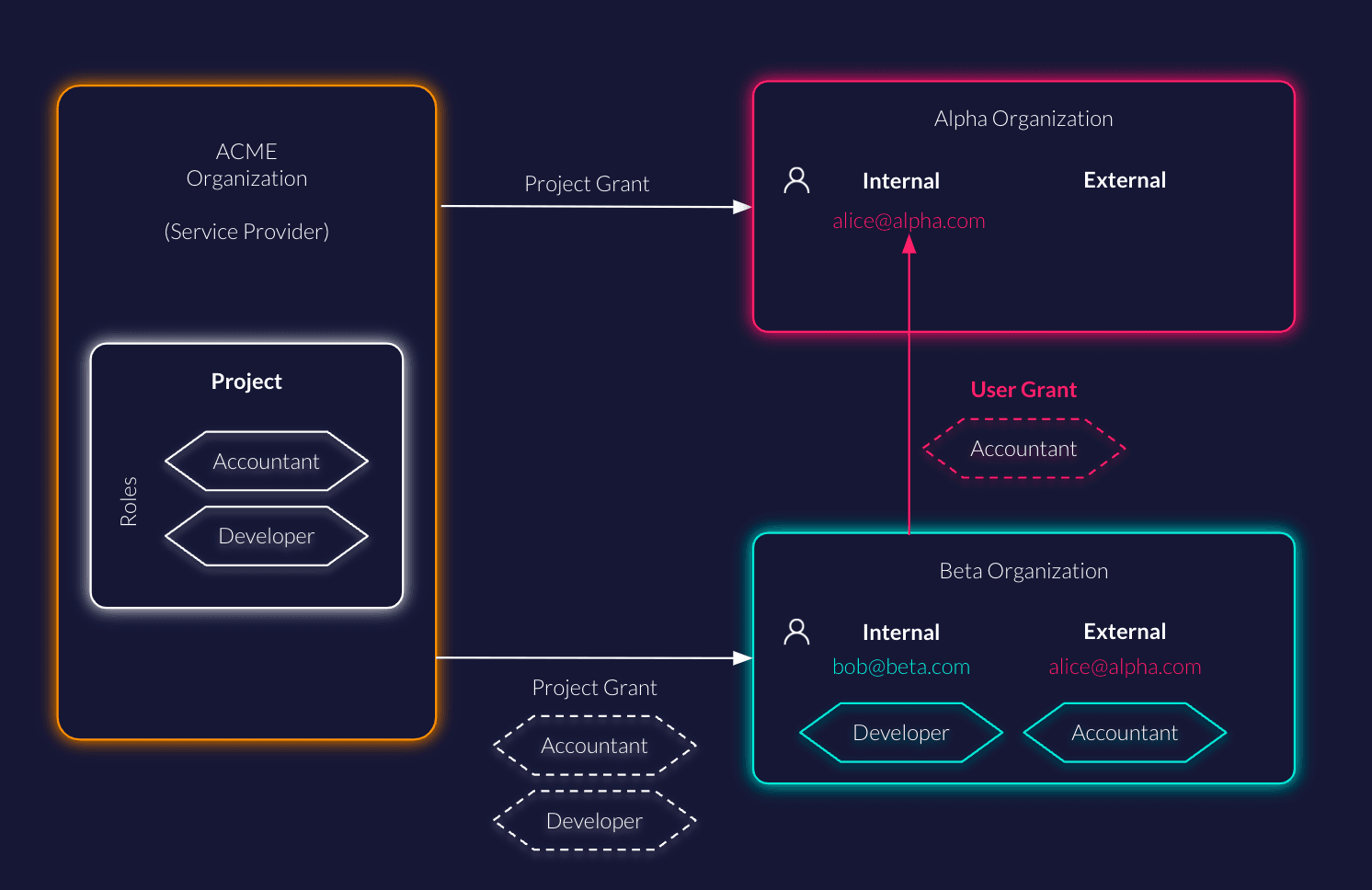 Project Grants are used to delegate access management of an entire project (or specific roles of the project) to another organization.