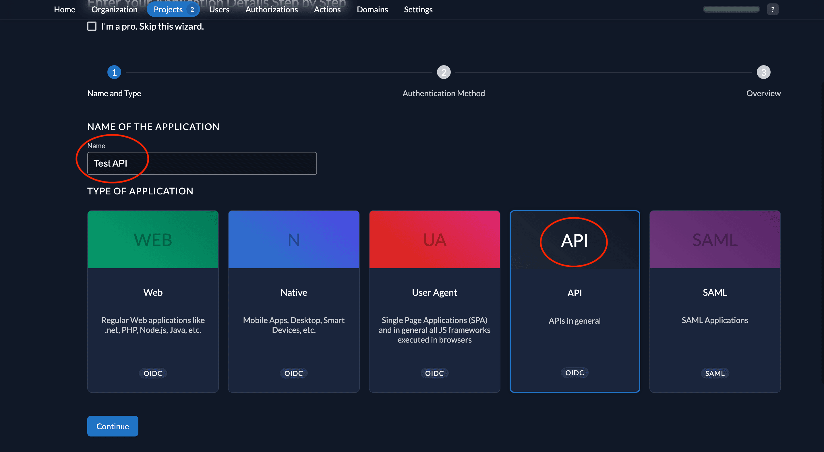 - Give a name to your application (Test API is the name given below) and select type API.