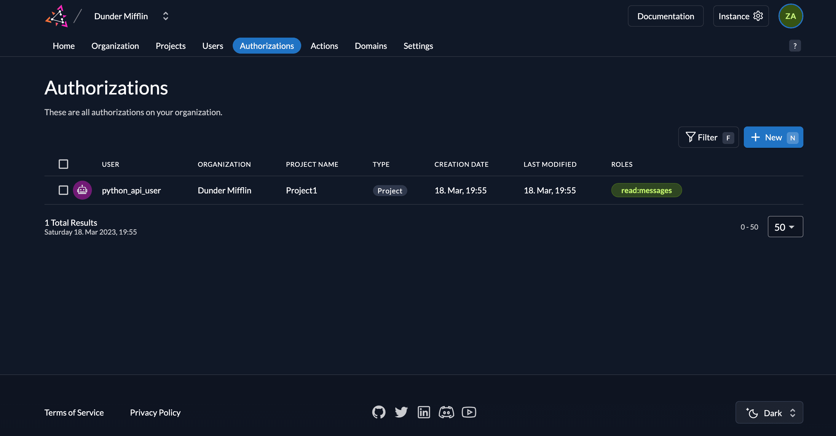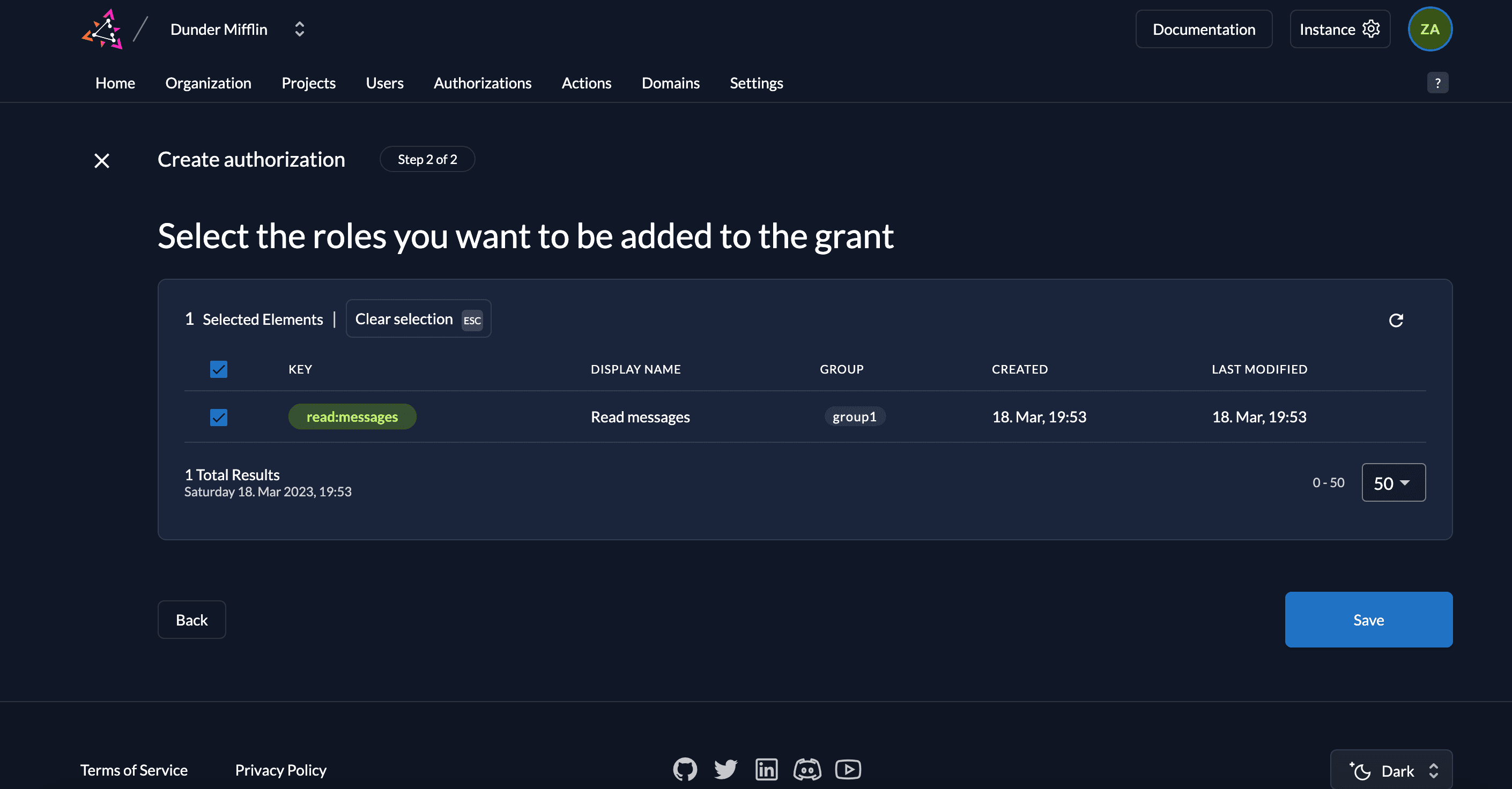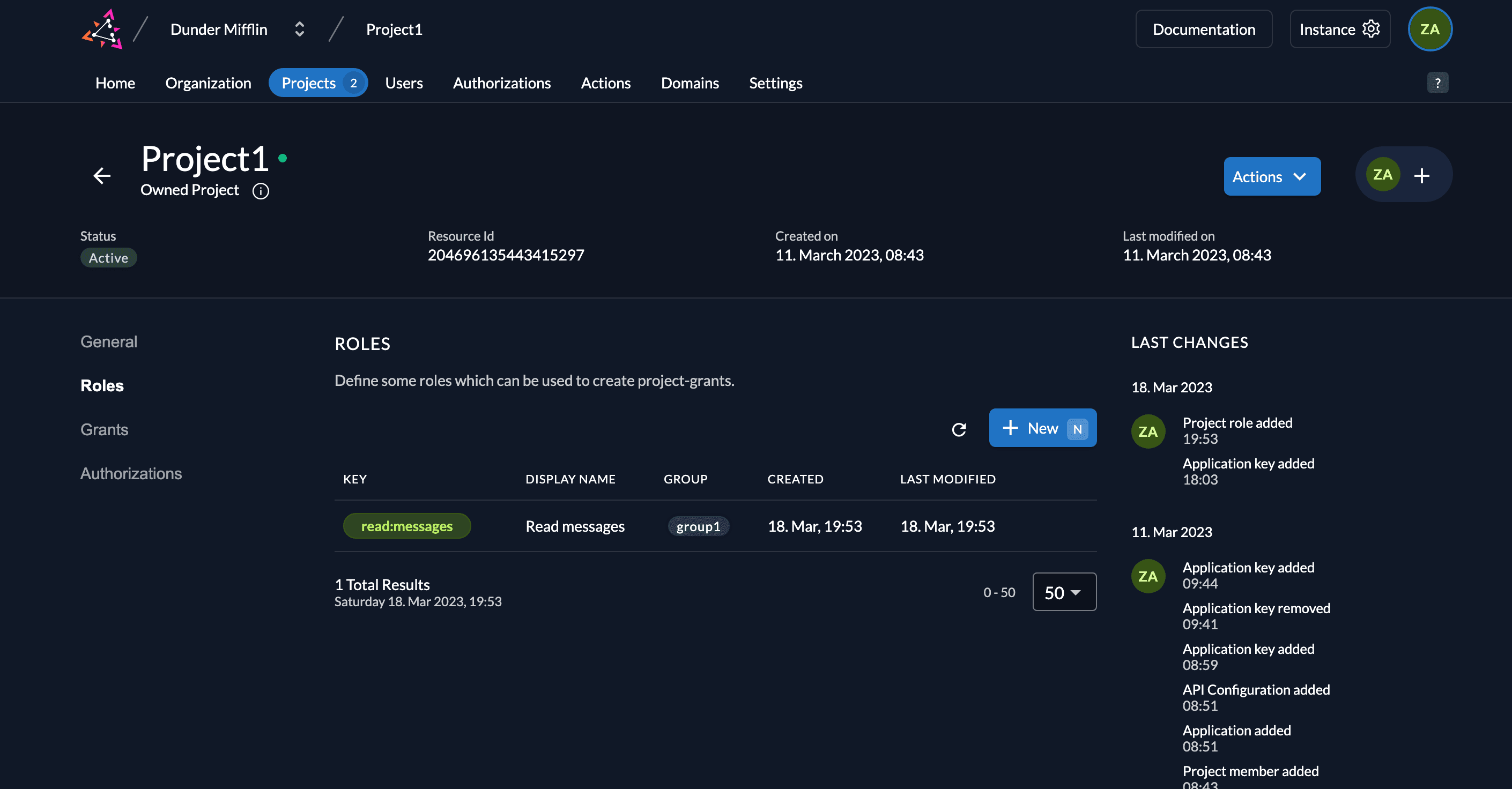 In order to access this route, you must create the role read:messages in your ZITADEL project and also create an authorization for the service user you created by adding the role to the user. Follow these steps to do so: