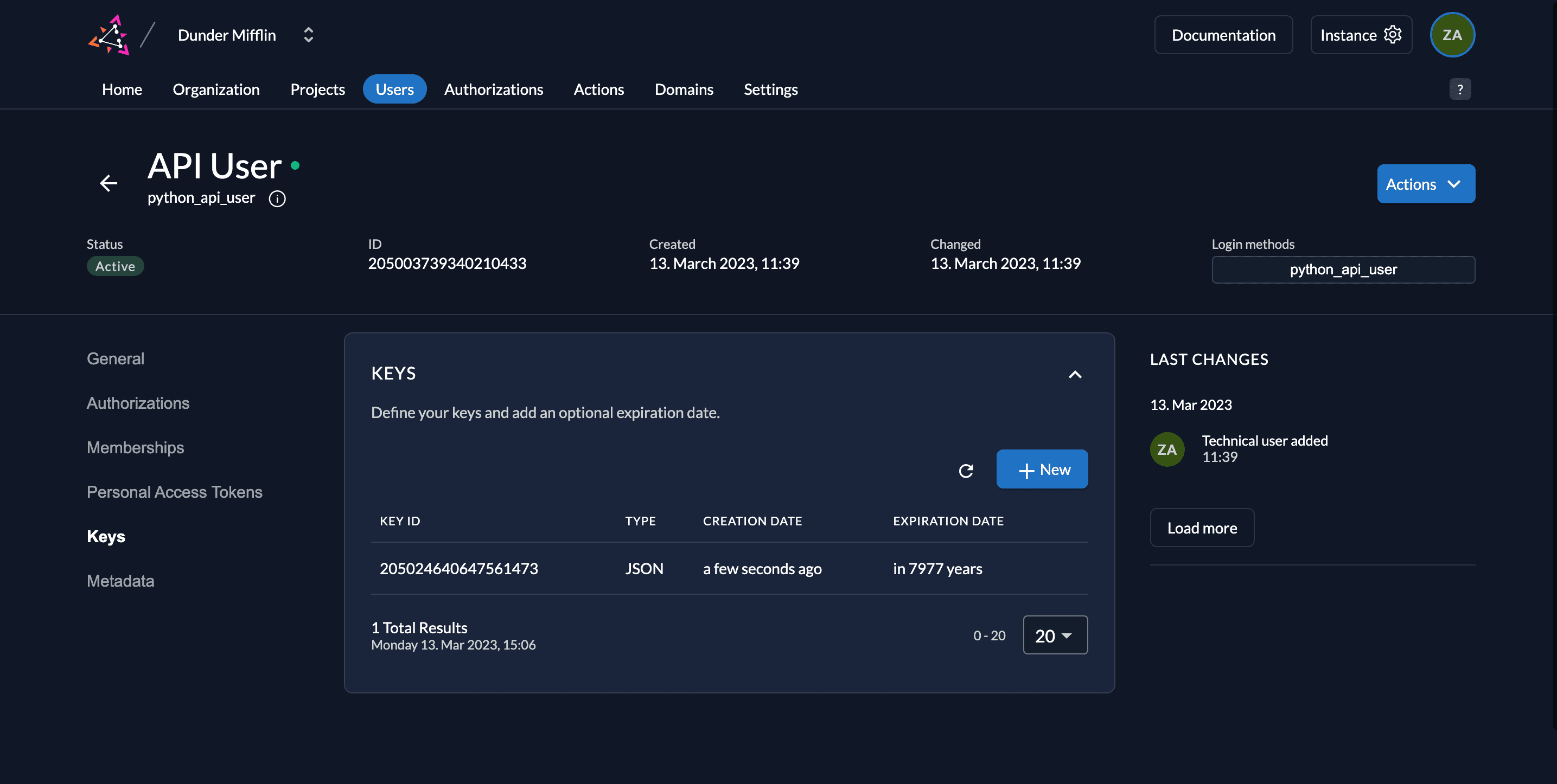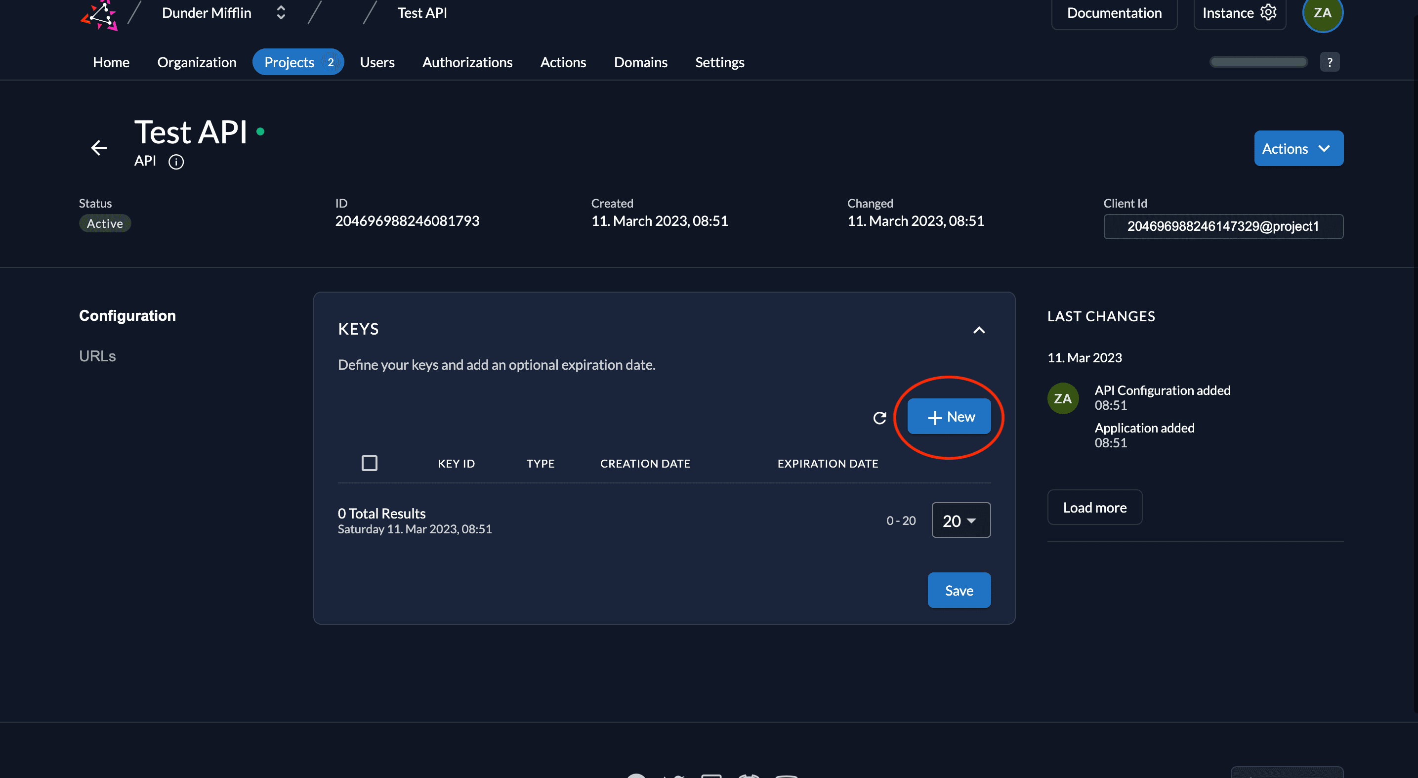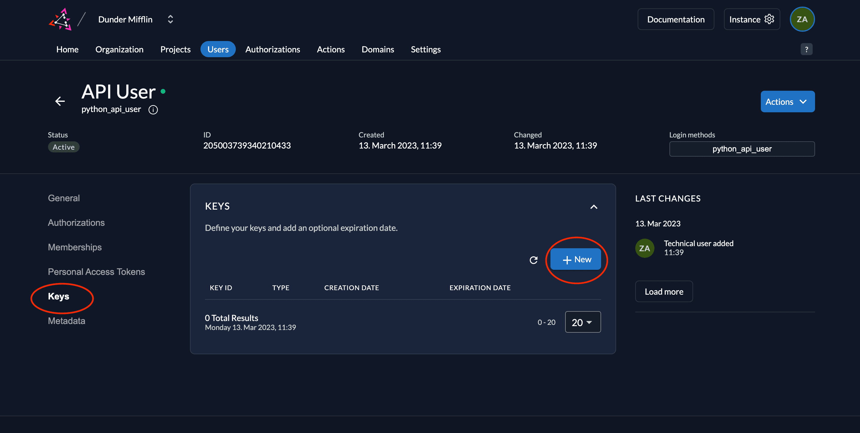 - Next, we need to generate a private-public key pair in ZITADEL and you must get the private key to sign your JWT. Go to Keys and click on New.