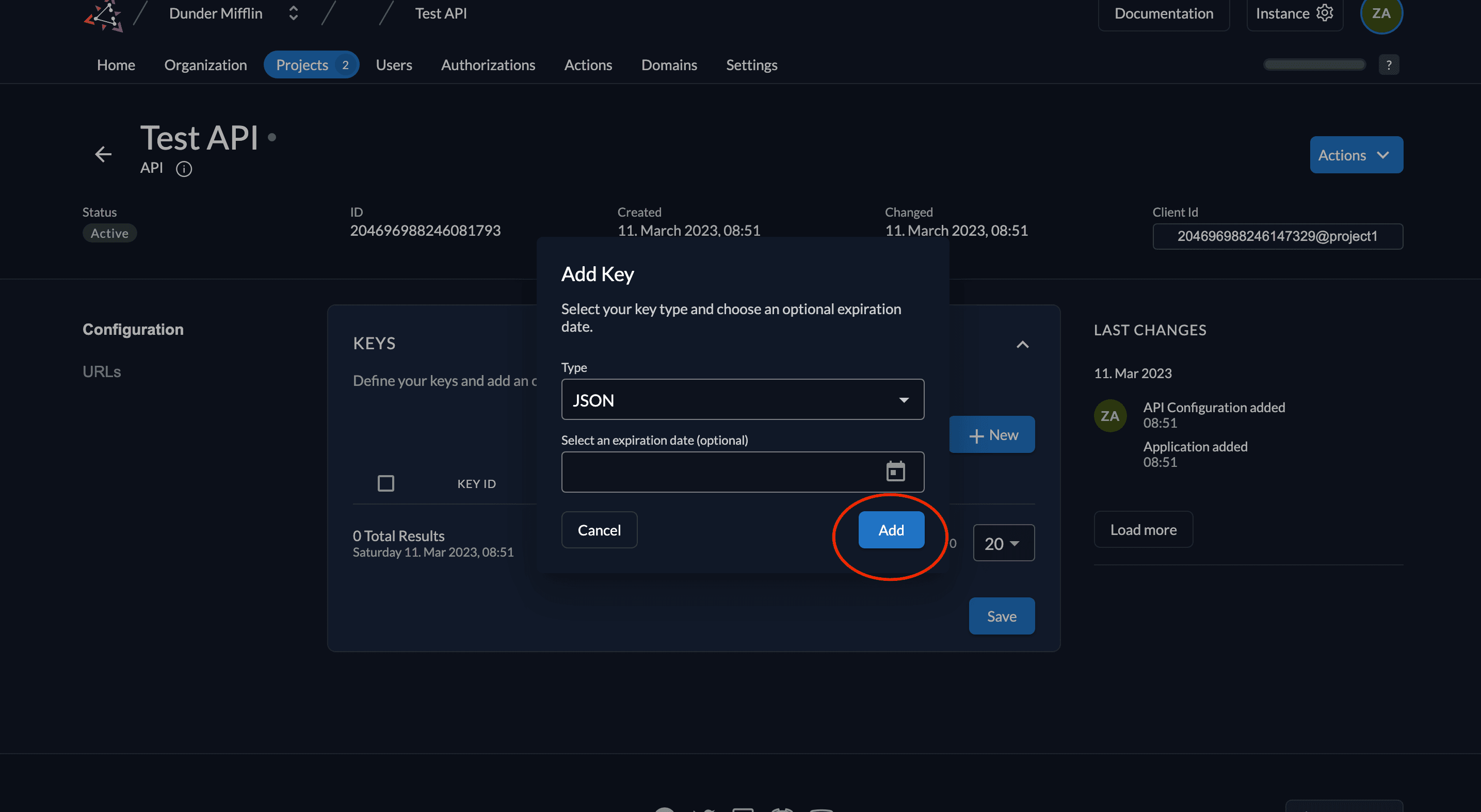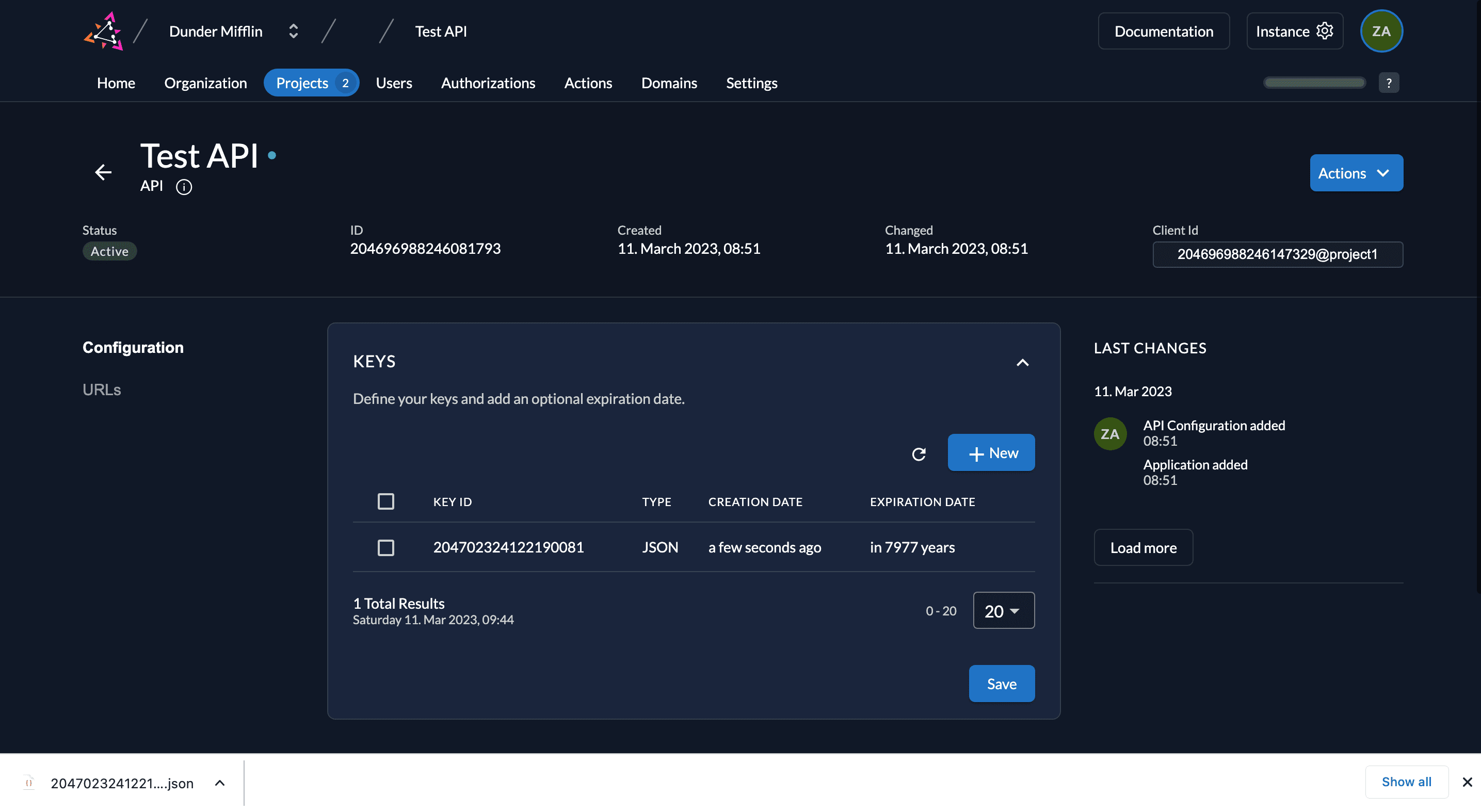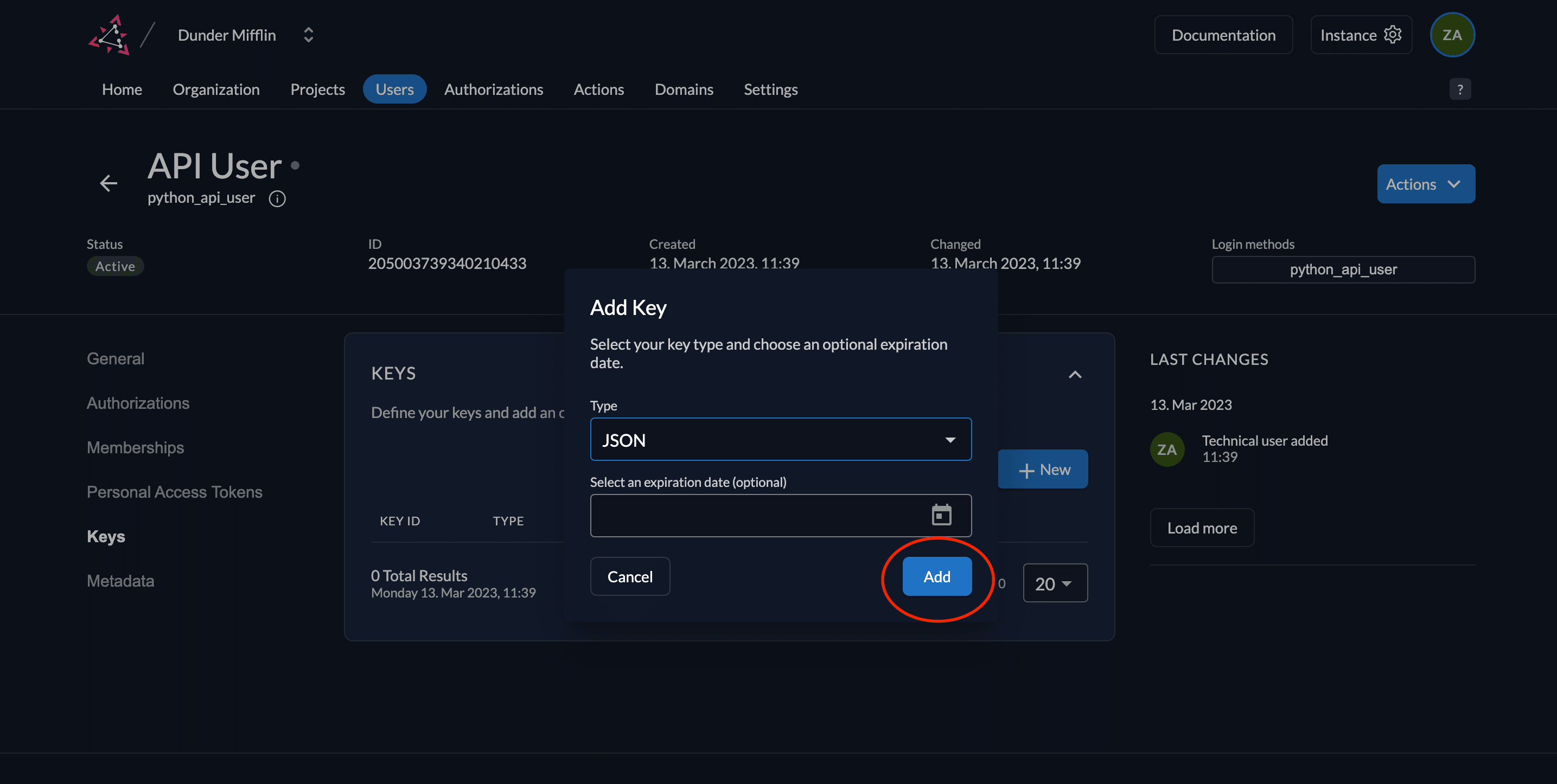 - Next, we need to generate a private-public key pair in ZITADEL and you must get the private key to sign your JWT. Go to Keys and click on New.