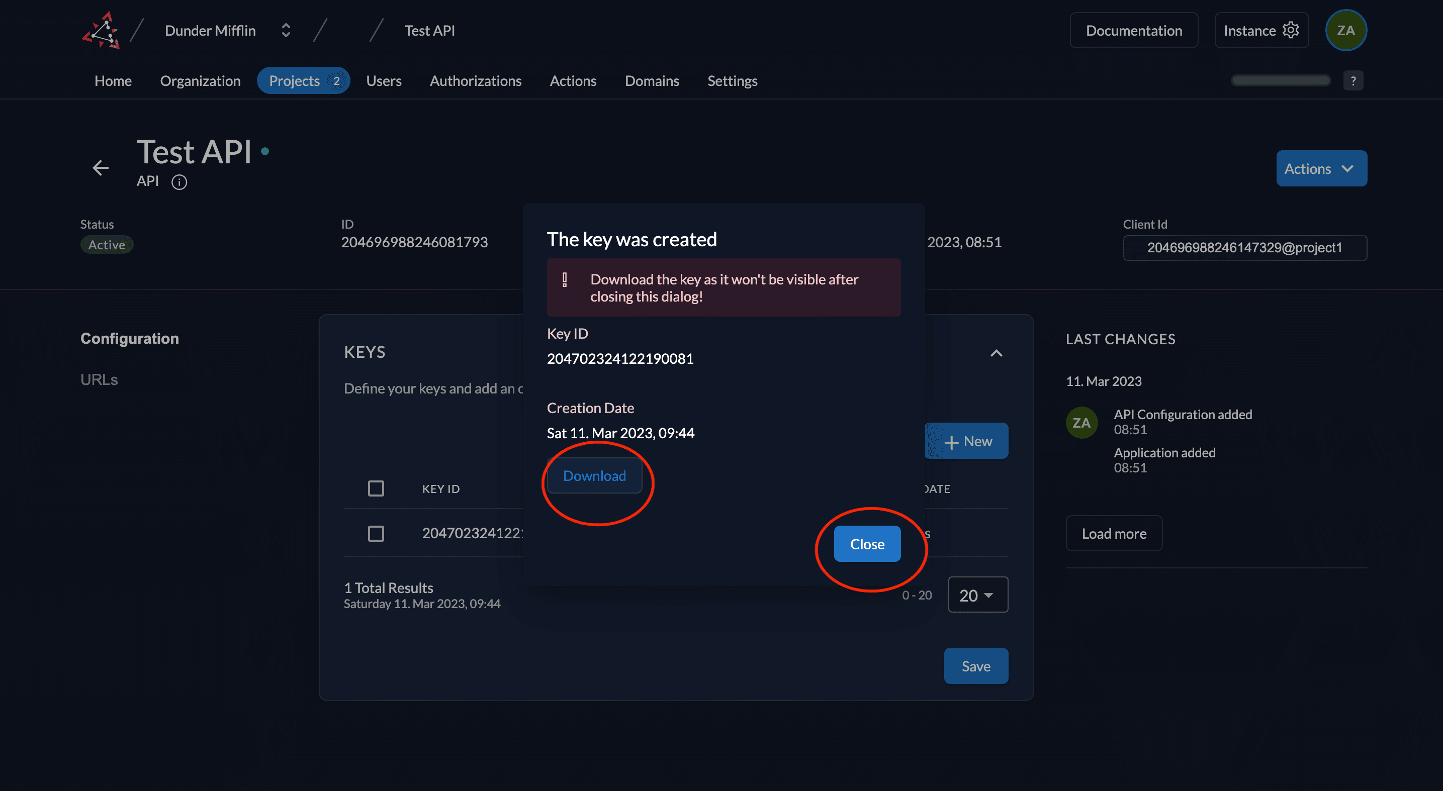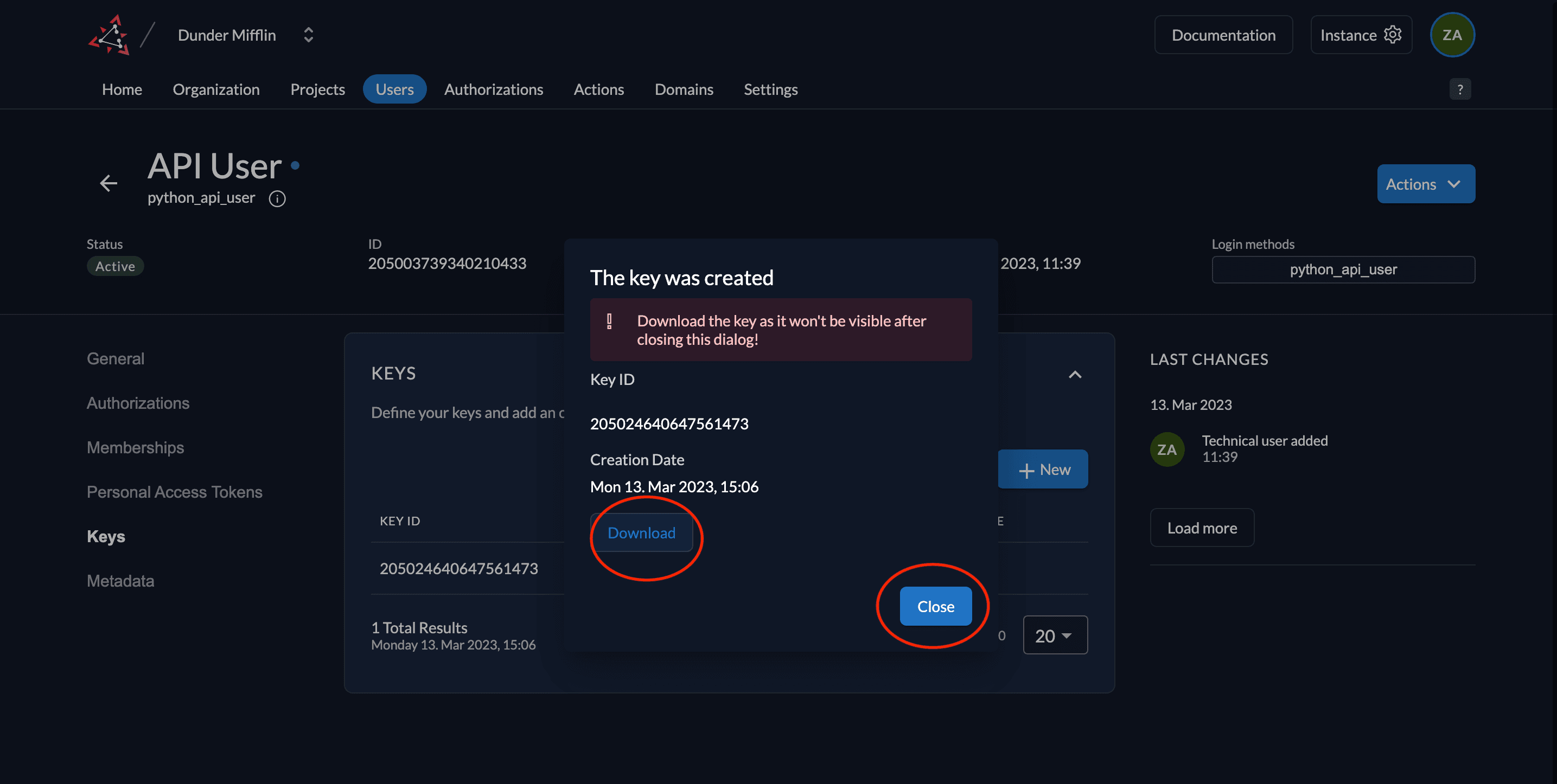 - Download the created key by clicking the Download button and then click Close.
