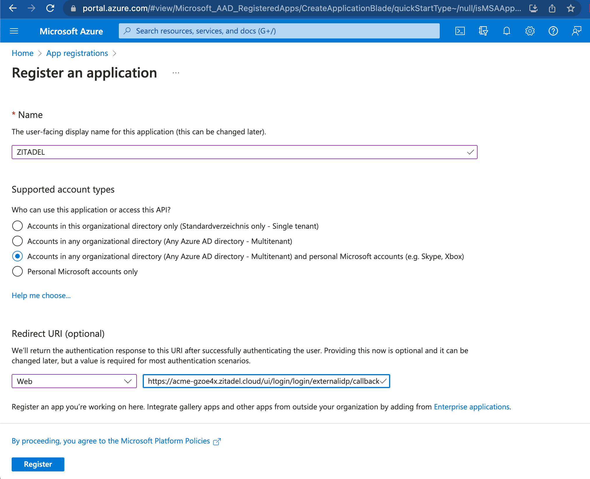 - Give the application a name and choose who should be able to login (Single-Tenant, Multi-Tenant, Personal Accounts, etc.) This setting will also have an impact on how to configure the provider later on in ZITADEL.