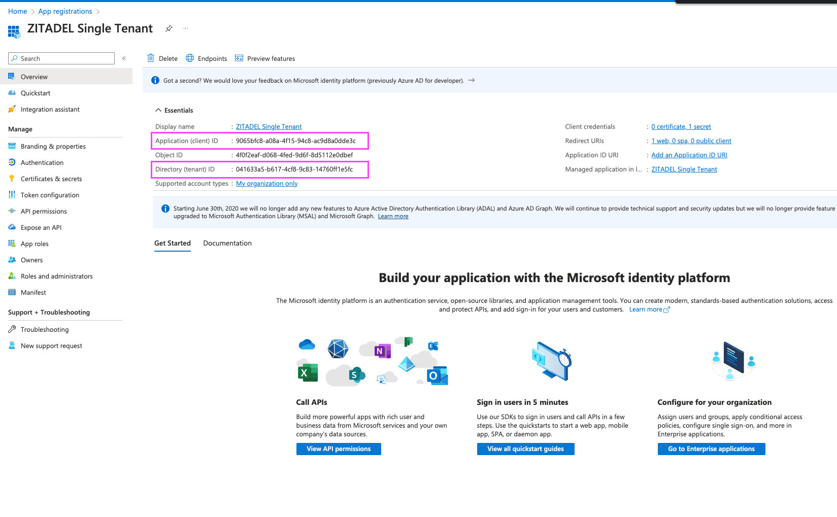 - Save the Application (client) ID and the Directory (tenant) ID from the detail page