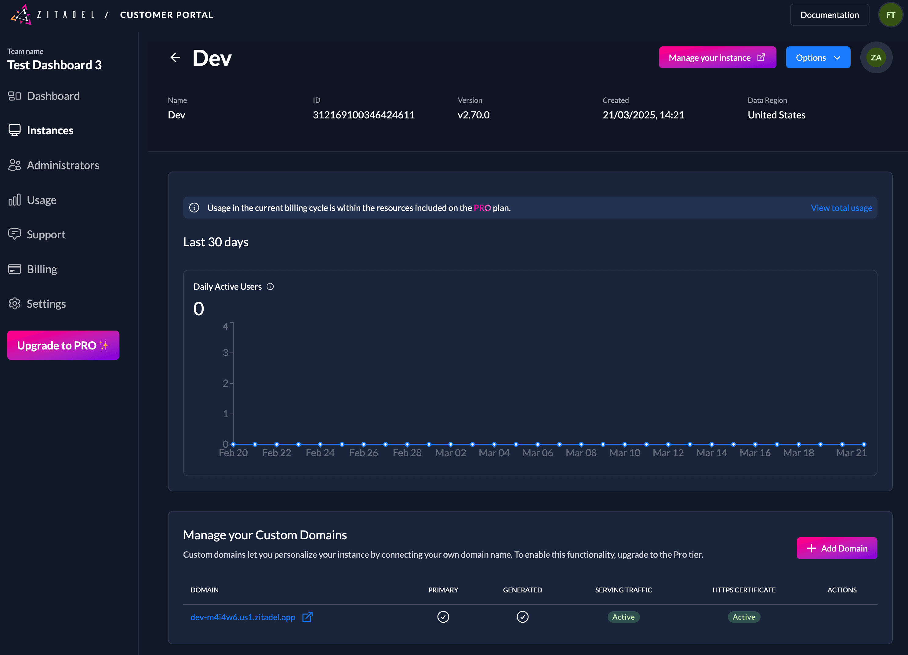 Every new instance gets a generated domain of the form [instancename][randomnumber].zitadel.cloud