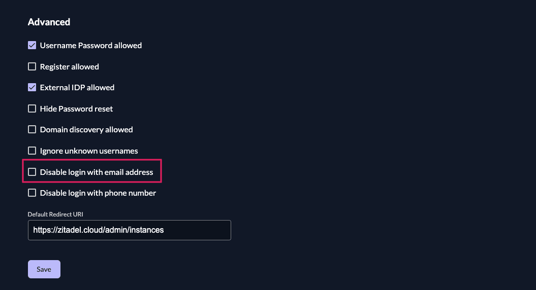 - Disable "Username Password Allowed" and enable "External IDP allowed" in the Advanced Section