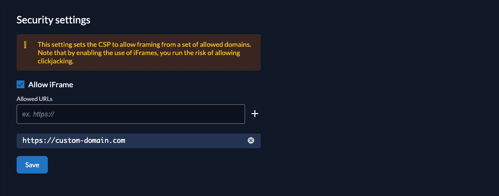 - Enable the "Allow IFrame" and add the host(s) you load the iframe from.